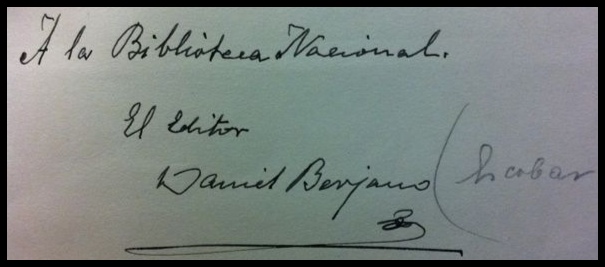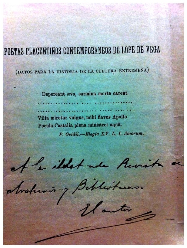 Ejemplar de su libro Poetas Placentinos Contemporáneos De Lope De Vega, dedicado por él a la Biblioteca Nacional ( BN )
