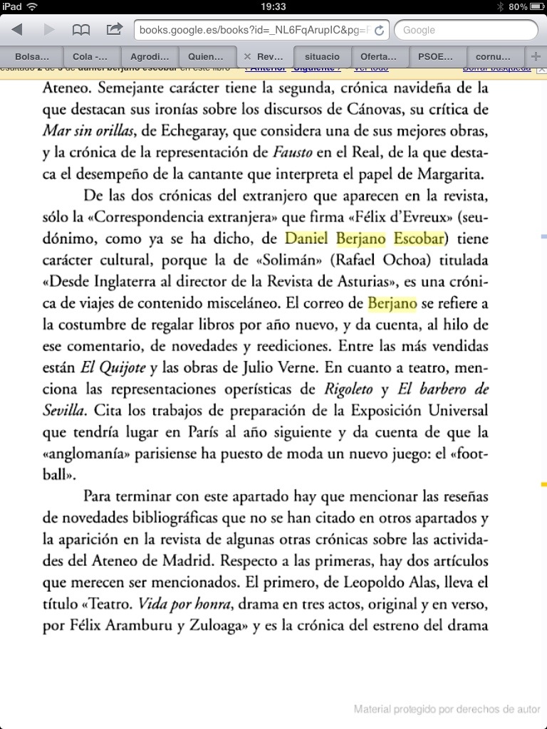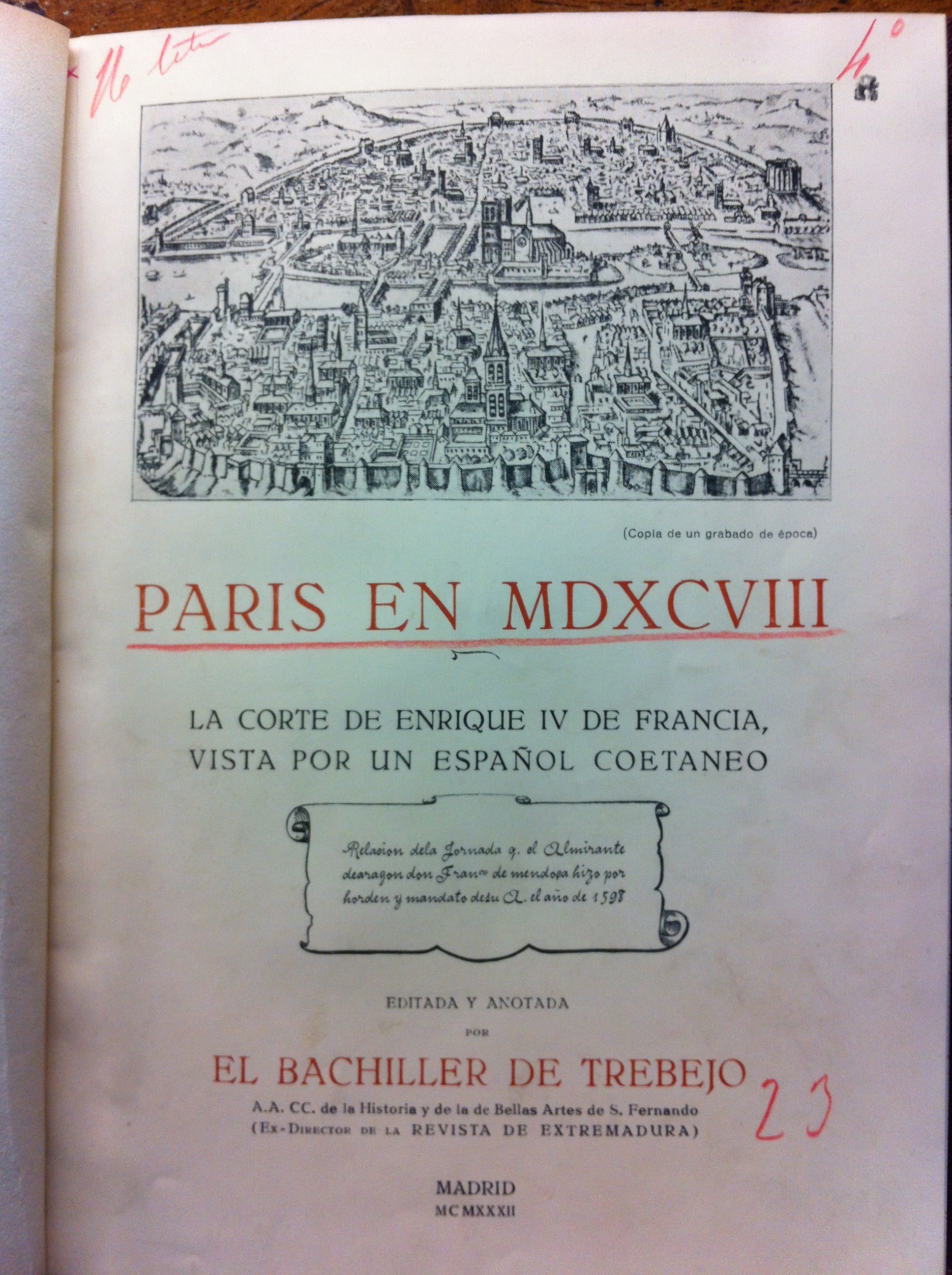 Ejemplar en BN de su libro «París en MDXCVIII: La Corte de Enrique IV de Francia, vista por un español coetáneo. Relación dela jornada q. el almirante de Aragón don Franco de Mendoça por orden y mandato desu A. el año de 1598