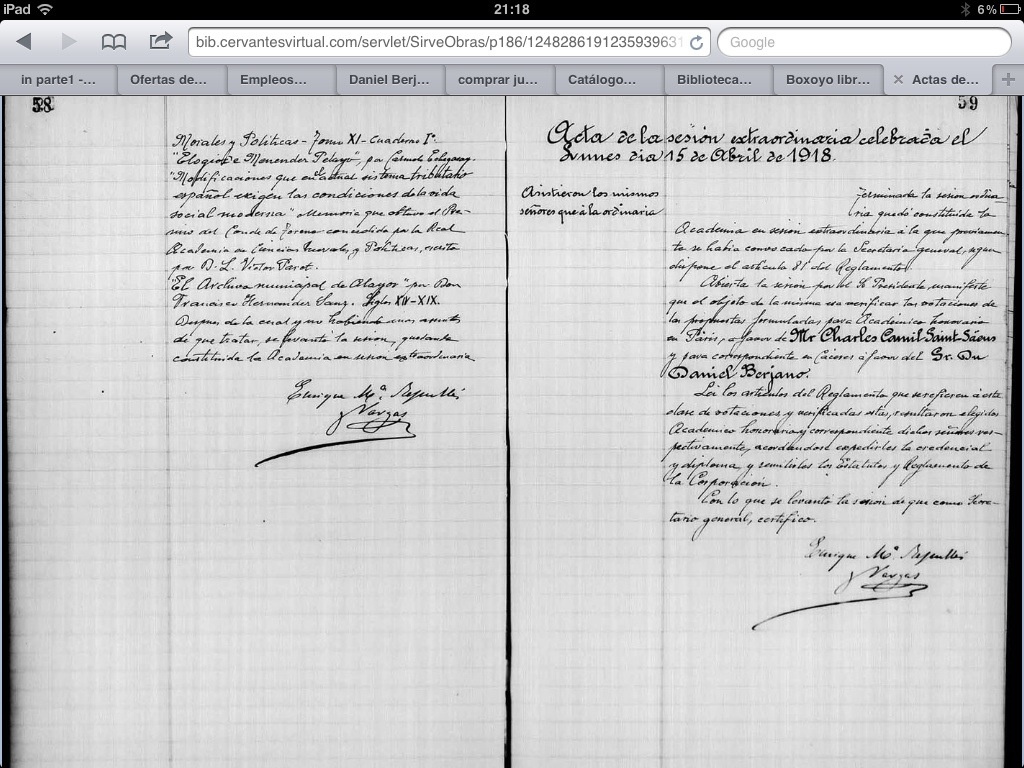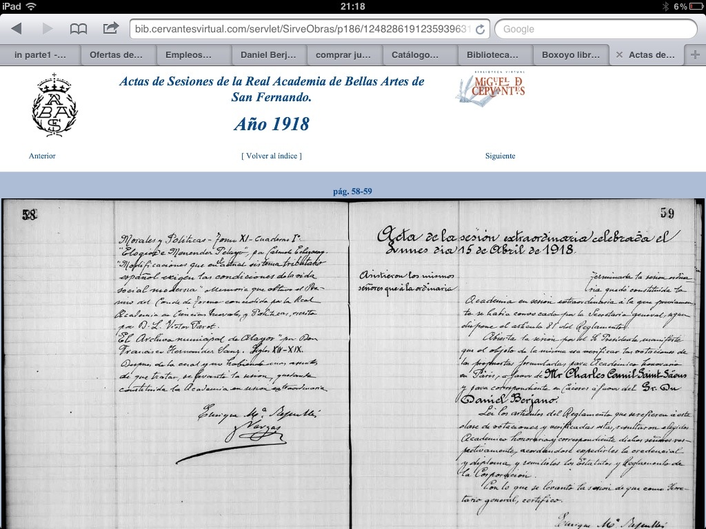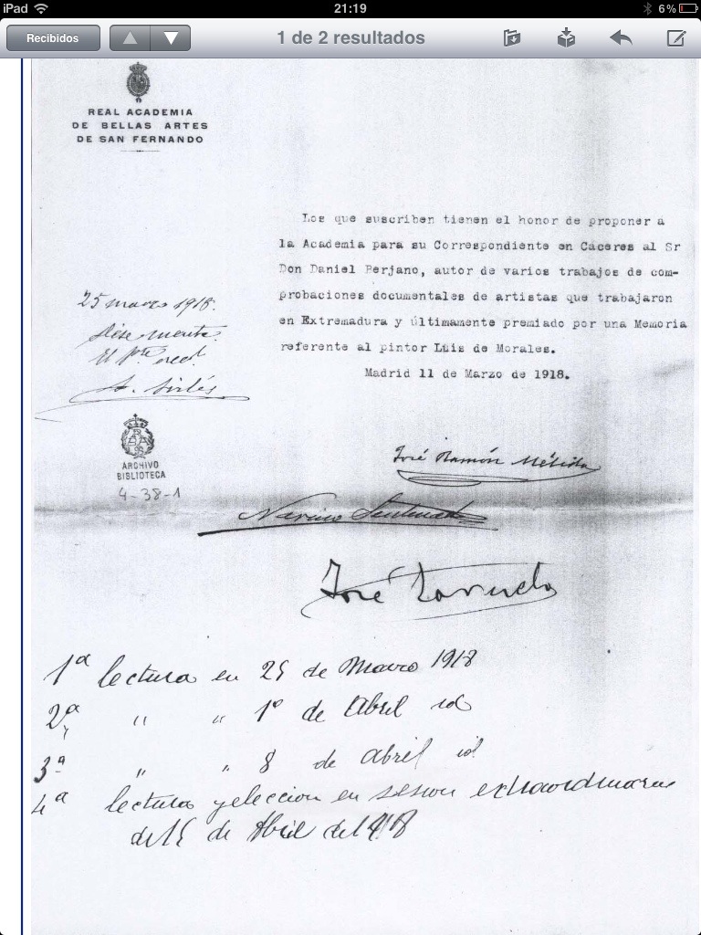 Acta de la sesión del Lunes 15 de Abril de 1918, en la que fue nombrado miembro de la Real Academia de las Artes de San Fernando
