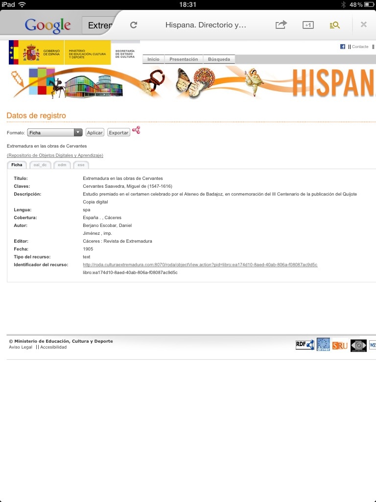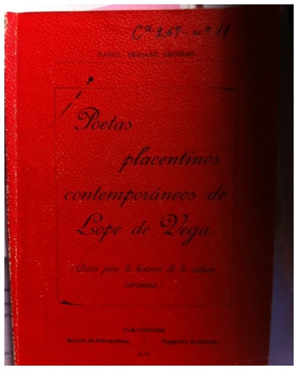 Su libro Poetas placentinos contemporáneos de Lope de Vega (1901) , ejemplar de la BN