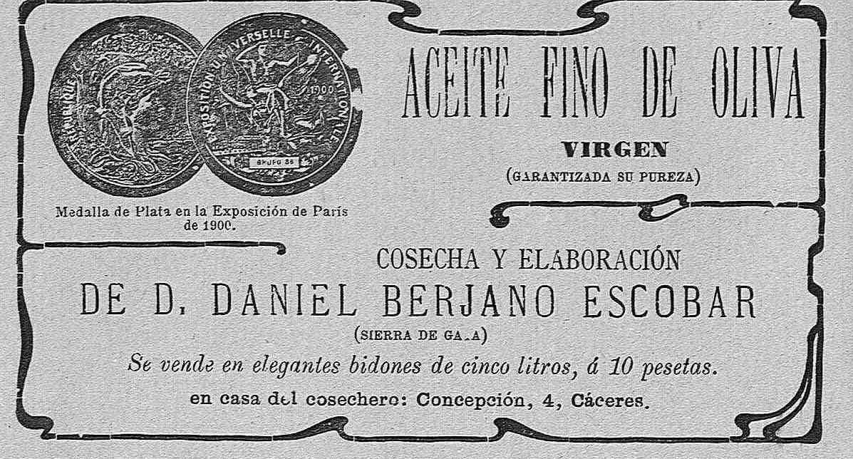 Publicidad original de su empresa de Aceite de Oliva , que obtuvo reconocimiento Internacional por su calidad con Medalla de Plata en la Exposición de París de 1900 , llamado oro verde, como dijo en su libro Daniel Berjano, «el bachiller de Trevejo», «estamos en Valverde del Fresno, el país del aceite de oro»