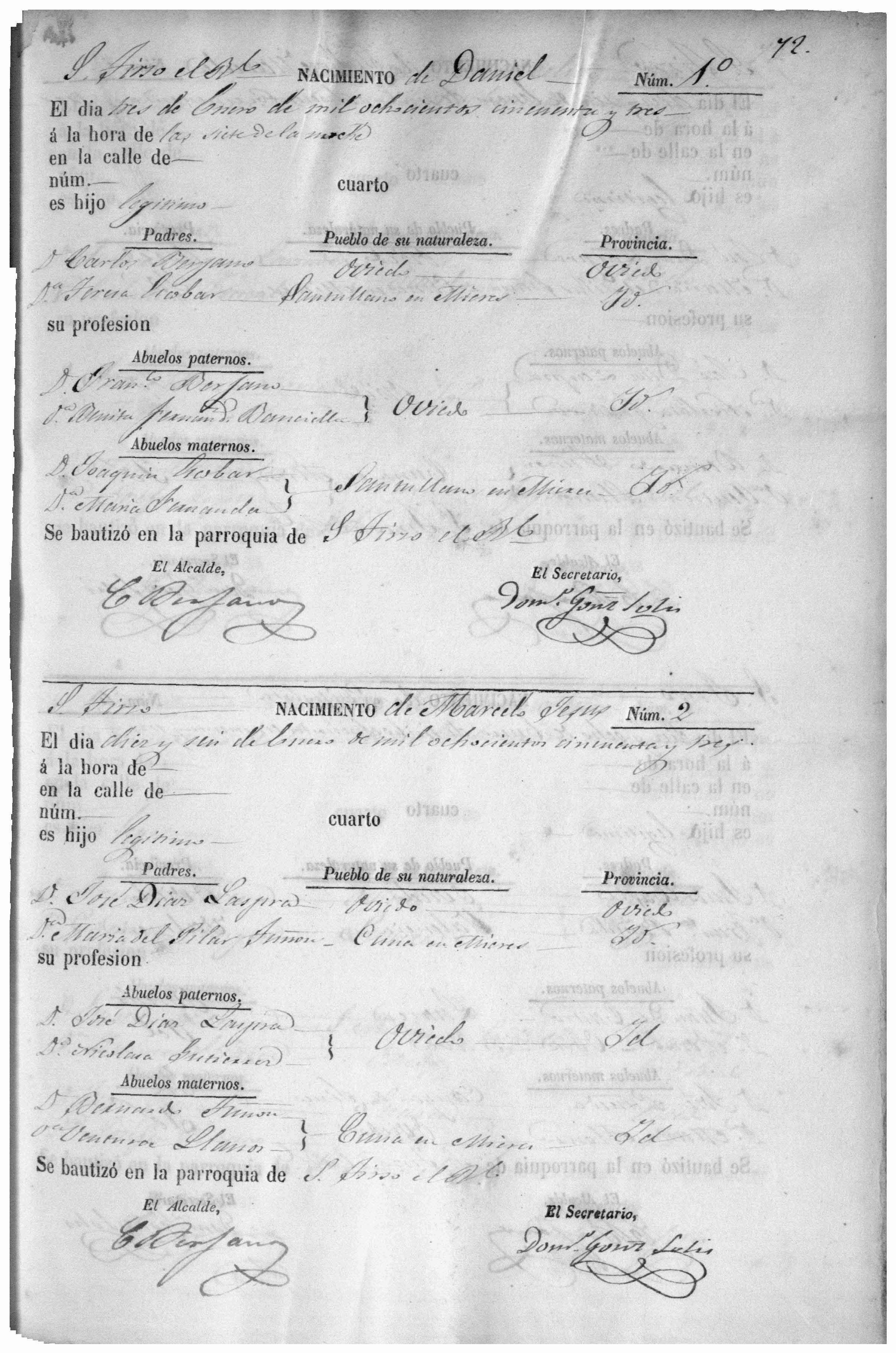 Bueno, pues casado don Daniel Berjano con doña Engracia Górmez Simón, hija de don Juan Crisostomo, se dedicó al noble afán de la procreación. Tuvieron dos hijos: Víctor y Victoria. Pere hete aquí que doña Engracia falleció. Entonces don Daniel, al que se supone desconsolado viudo, buscó consuelo en su cuñada María Paz (hermana de la fallecida Engracia).. Al nuevo matrimonio tampoco le fue mal lo de la procreación: cuatro hijos trajeron al mundo.