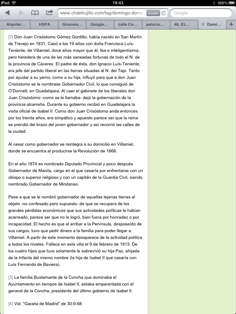 Don Juan Crisóstomo Gómez Gordillo, había nacido en San Martín de Trevejo en 1831. Casó a los 19 años con doña Francisca Luís-Teniente, de Villamiel, doce años mayor que él, fea e inteligentísima, pero heredera de una de las más saneadas fortunas de todo el N. de la provincia de Cáceres. El padre de ésta, don Ignacio Luís-Teniente, era jefe del partido liberal en las tierras situadas al N. del Tajo. Tanto por ayudar a su yerno, como a su hija, influyó para que a don Juan Crisóstomo se le nombrase Gobernador Civil, lo que consiguió de O’Donnell, en Guadalajara. Al caer el gabinete de los liberales don Juan Crisóstomo -como se le llamaba- dejó la gobernación de la provincia alcarreña. Durante su gobierno recibió en Guadalajara la visita oficial de Isabel II. Como don Juan Crisóstomo anda entonces por los treinta años, era simpático y apuesto parece ser que la reina se prendió del brazo del joven gobernador y así recorrió las calles de la ciudad.