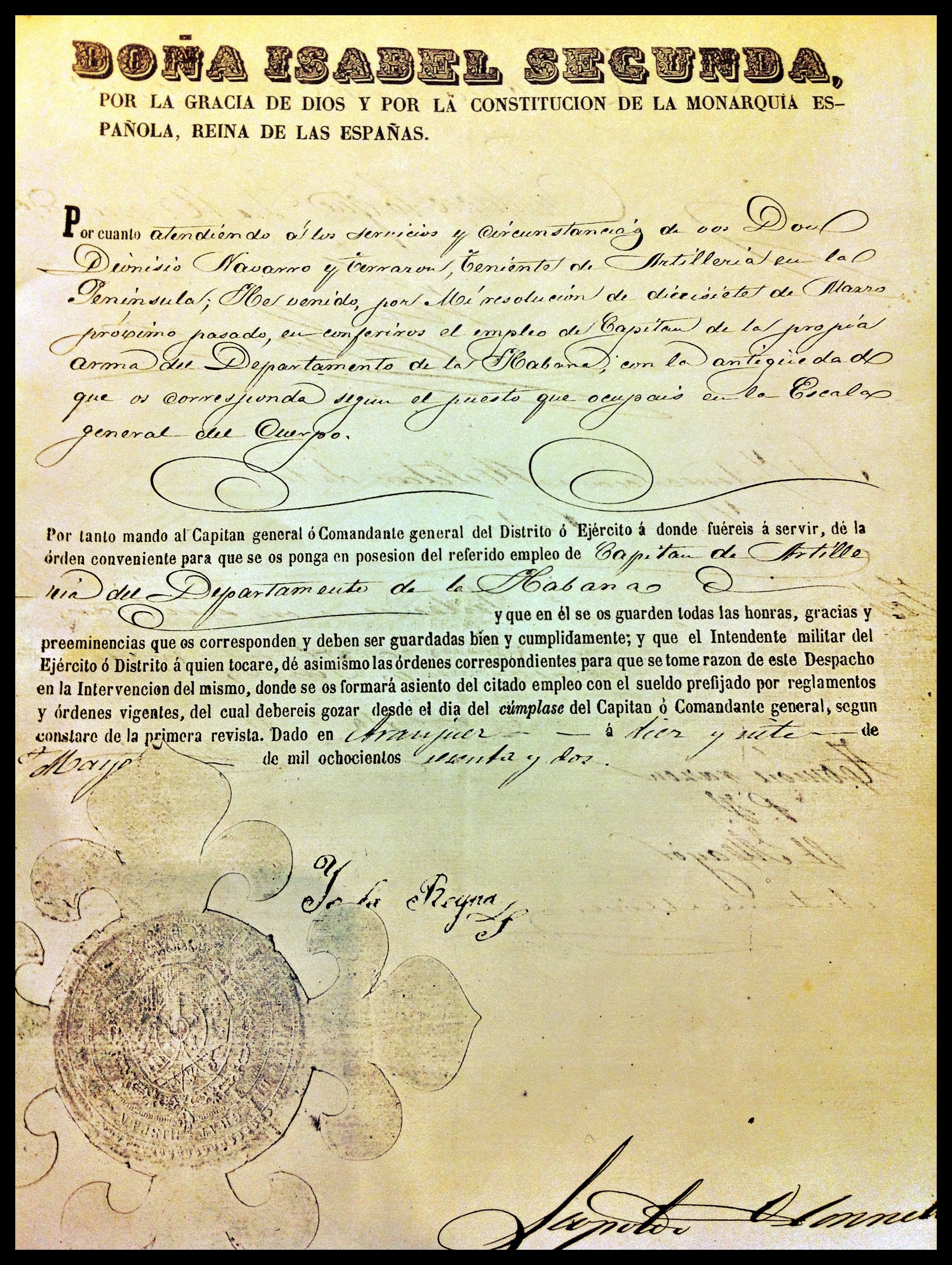Última gesta o desempeño militar del apellido Navarro de Egüi , Doña Isabel II mandó al padre de mi Bisabuela al conflicto de Cuba , firmó su destino cómo Capitán de Artillería con destino La Habana, en el Palacio de Aranjuez el 17 de mayo de 1862