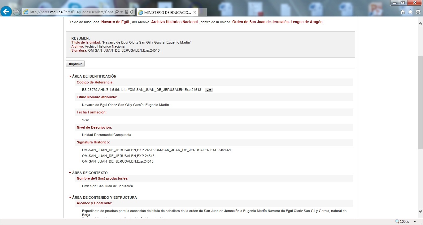 Expediente 24513 ,en el que se prueba la pertenencia a la Orden de San Juan de Jerusalén de D. Eugenio Navarro de Egüi y San Gil ( Borja )
